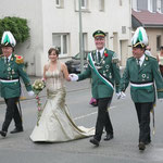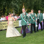 Rund ein dutzend Schützenbrüder liefern den zahlreichen Zaungästen auch nach dem Abräumen der Insignien ein zügiges Vogelschießen. Schlag auf Schlag knallt das Gewehr. Fast jeder Schuss wird mit einem Regen dicker Holzspäne belohnt. Nur 25 Minuten nach Beginn des Wettschießens um 10.40 Uhr neigt sich der angeschlagene Aar kurzzeitig nach rechts, um dann aber wieder in seine aufrechte Position zurückzukehren. Als um 11.10 Uhr eine Kugel dem Holzvogel den Kopf wegreißt, lichtet sich das Feld der Aspiranten merklich. Zeitweise nur zu fünft setzen die Kameraden dem gefiederten Tier weiter zu. Erst als Tobias Pohler um 11.35 Uhr den rechten Flügel erlegt, wird auch Martin Siedhoff aktiv. Schnell wird klar: Pohler, Siedhoff und Frank Grundmann machen den Kampf um die Königswürde unter sich aus. Um 11.50 Uhr folgt der zweite Flügel dem Schicksal des ersten. Tobias Pohler konzentriert sich, visiert lange an, drückt ab: Der Vogel neigt sich bedenklich nach vorne, bleibt aber beharrlich auf seinem Platz. Ein Raunen geht durch die Reihen, Pohler wirft verärgert die Hände in die Luft. Als nächster kommt Martin Siedhoff an die Reihe, ein siegessicheres Lächeln auf den Lippen. Ein gezielter Schuss aus der Hand des 33-Jährigen holt die Reste de Vogels schließlich mit der 146. Kugel um 11.55 Uhr zu Boden. „Überragend, sensationell, einfach toll“, jubelt der frisch gebackene Steinhäuser Schützenkönig Martin Siedhoff auf den Schultern seiner Kameraden dem klatschenden Publikum zu. Zu seiner Königin erwählt der Ingenieur Freundin Susanne Pohler. Gemeinsam ließ sich das Paar ausgiebig vom begeisterten Schützenvolk feiern.